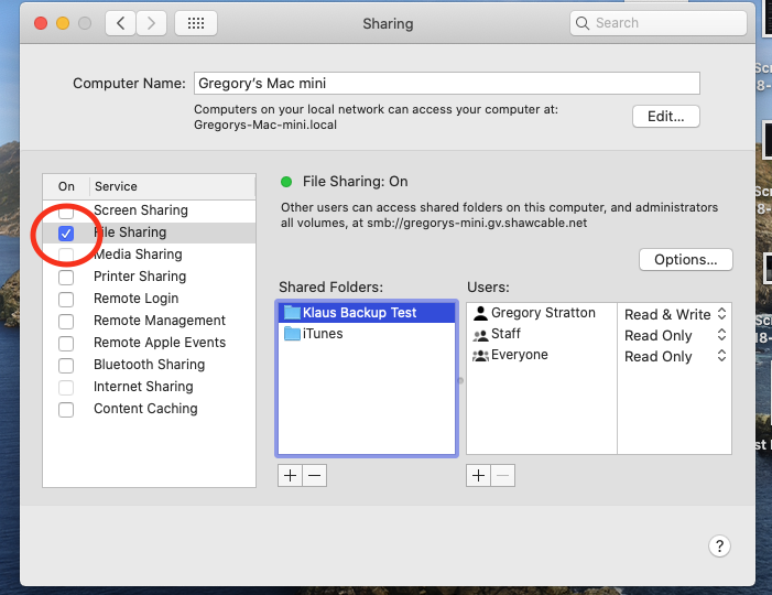 Select your folder and click Open. Ensure Permission is set to "Read & Write." Then click Options and confirm SMB File Sharing is enabled for your folder: