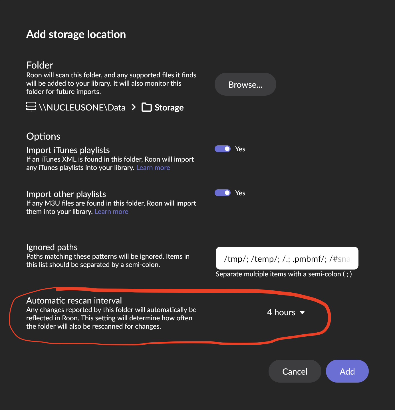 Network storage devices don’t always report file changes to Roon in real time. Users can set an Automatic Re-scan Interval to determine how often Roon will scan for file-level changes, including newly added, removed, or modified music files. At each interval, Roon reconnects to the network share and scans the directory structure to detect differences. If it finds new content, it will import it into Roon and check for appropriate metadata and artwork.