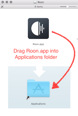 - In the Disk Image window, drag the Roon icon into the Applications folder