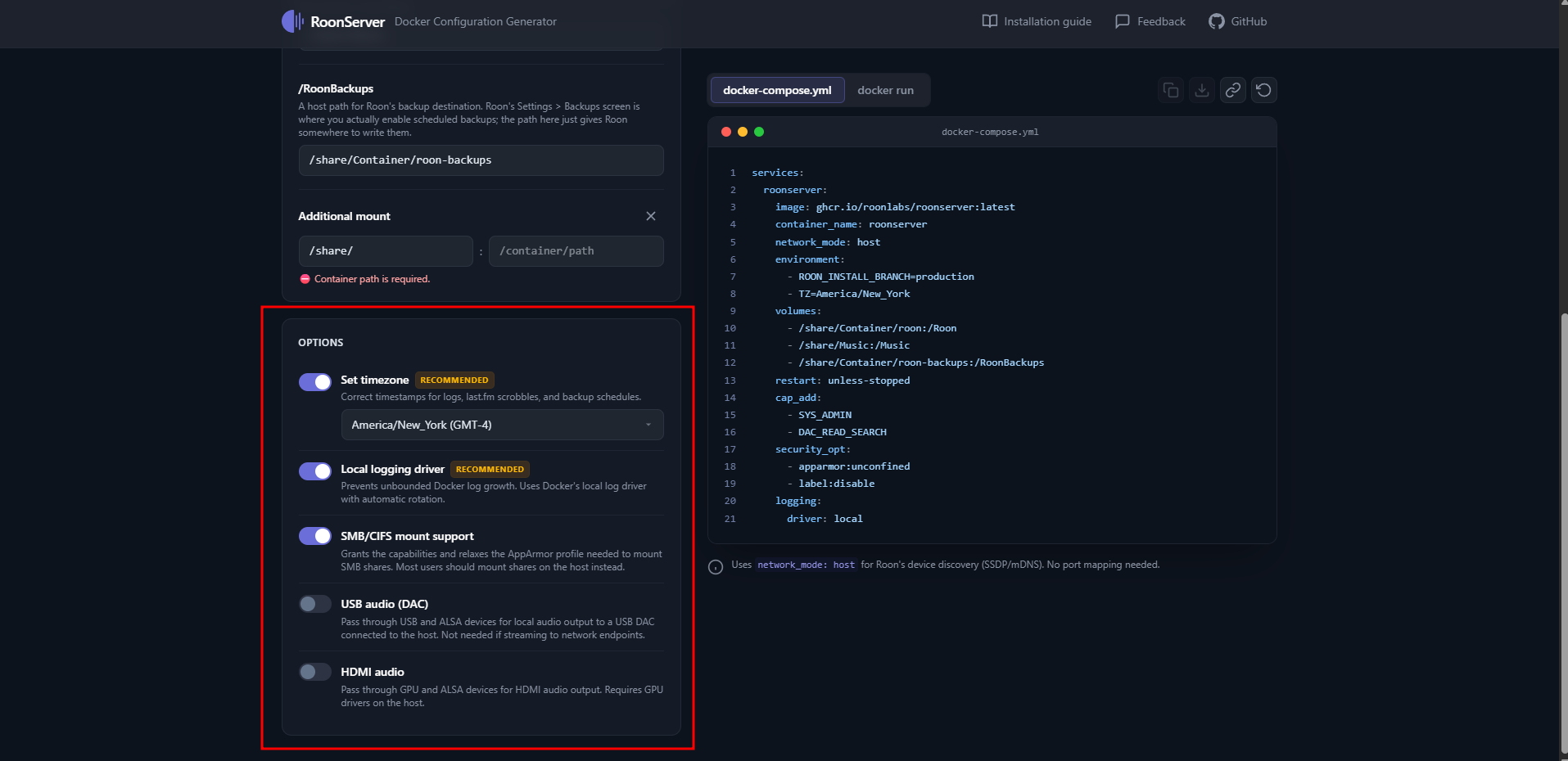 The most important one is host networking. Host networking is required for Roon discovery. Without it, Roon Remote may not find RoonServer, and RoonServer may not discover audio devices on your network.