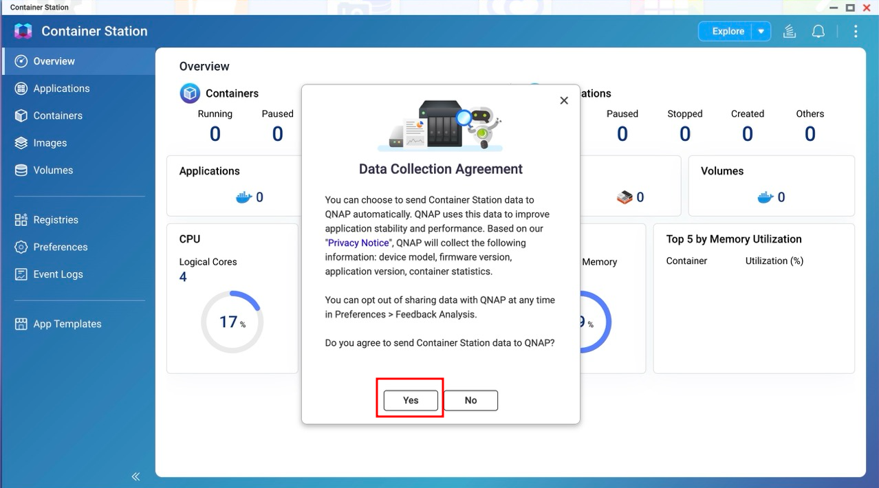 If QNAP asks where to install Container Station, select the storage volume where you want the Container Station data to live.