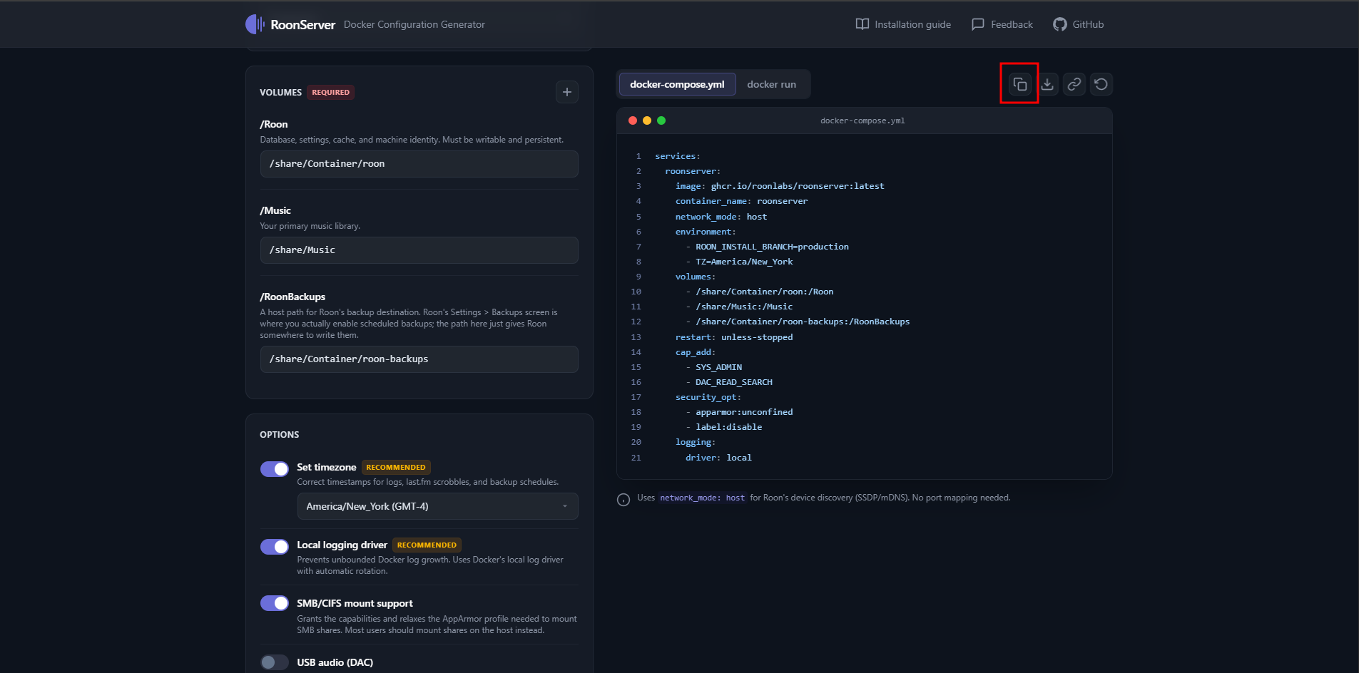 Generate the Roon Docker Configuration Generator: https://roonlabs.github.io/roon-docker/