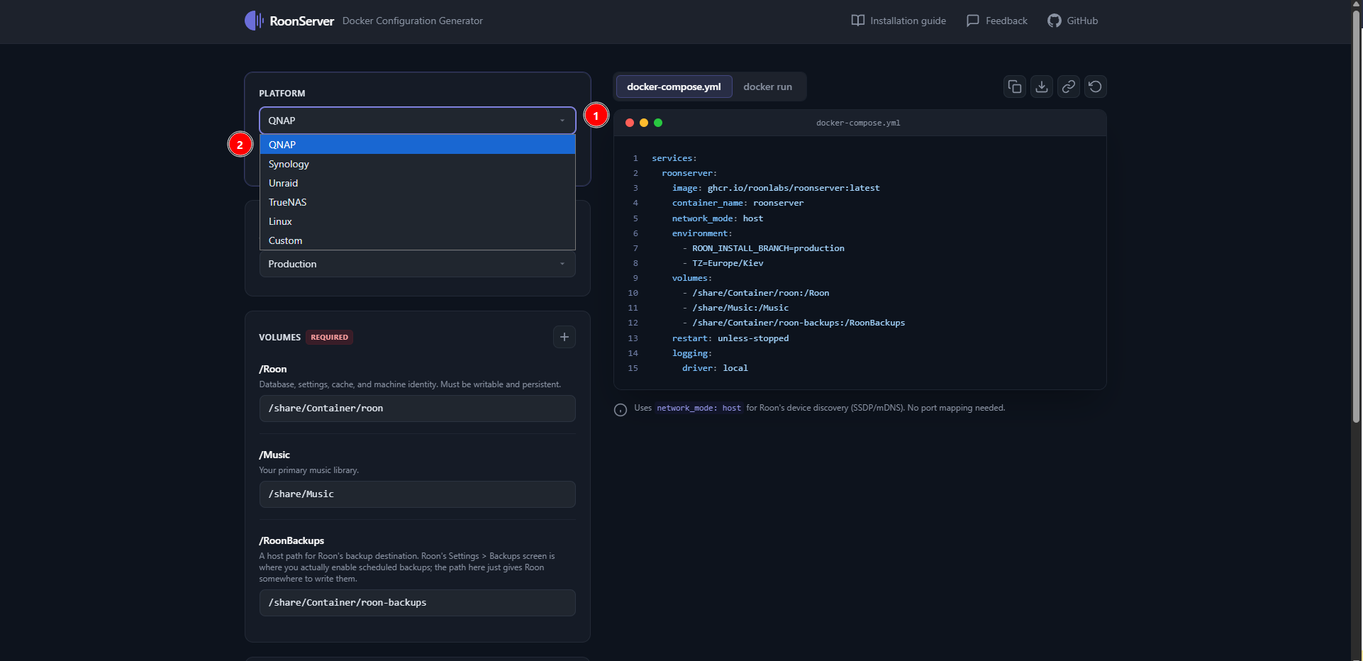 The generated Compose file should include mappings for the main Roon folders:
