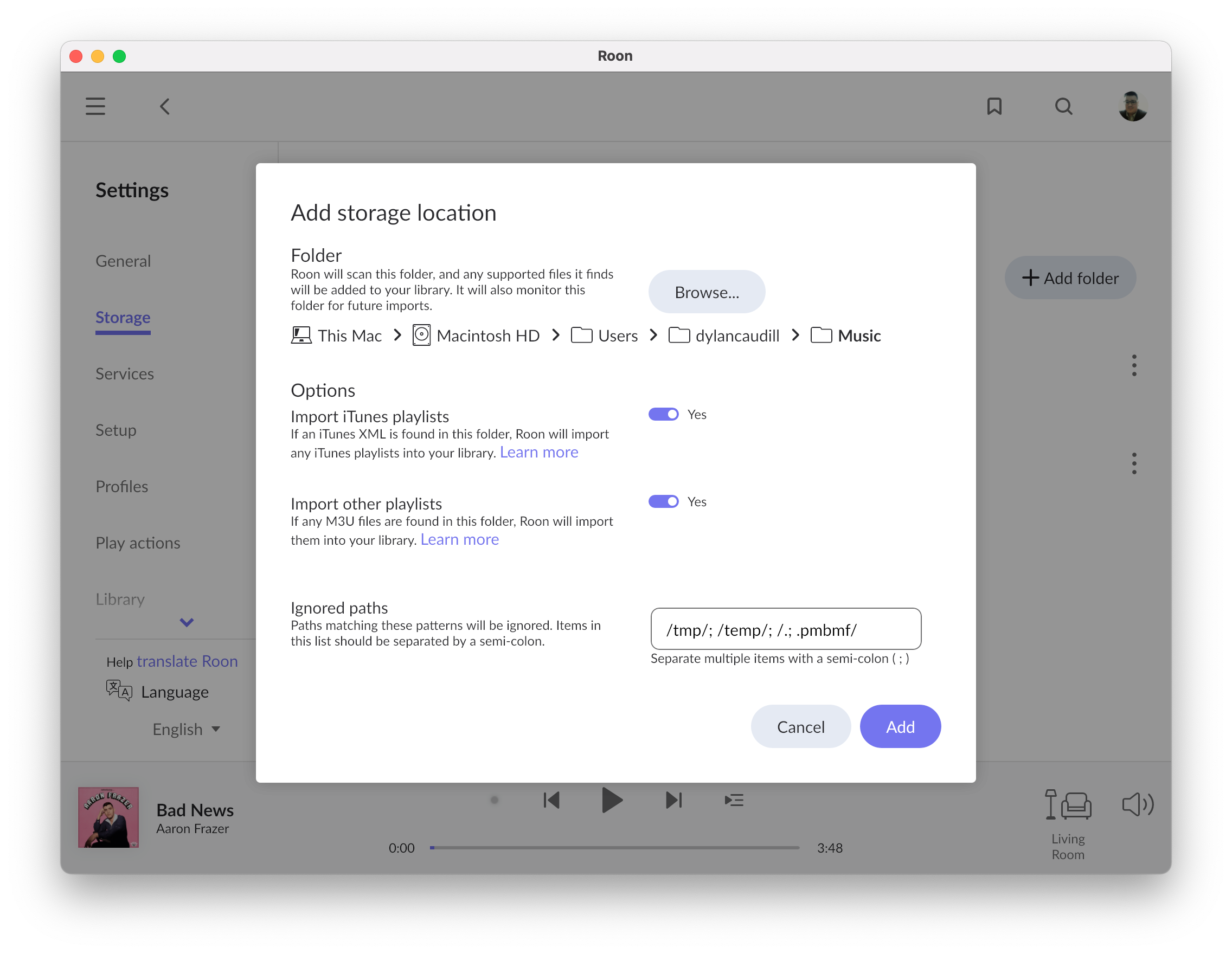 that is running Roon Server. Notice that you have options to import iTunes content and Playlists on this screen. Roon can also ignore the content of folders where the path contains a pattern matching those listed in the Ignored Paths field.