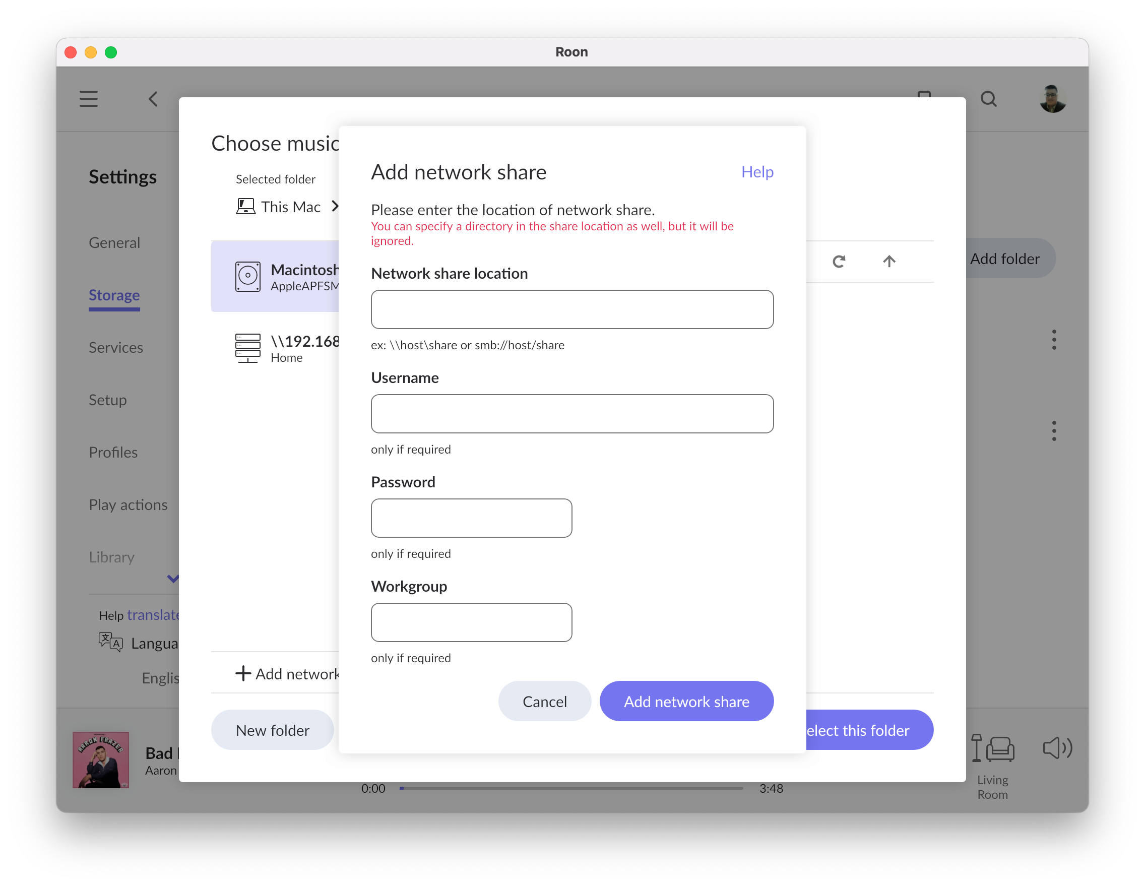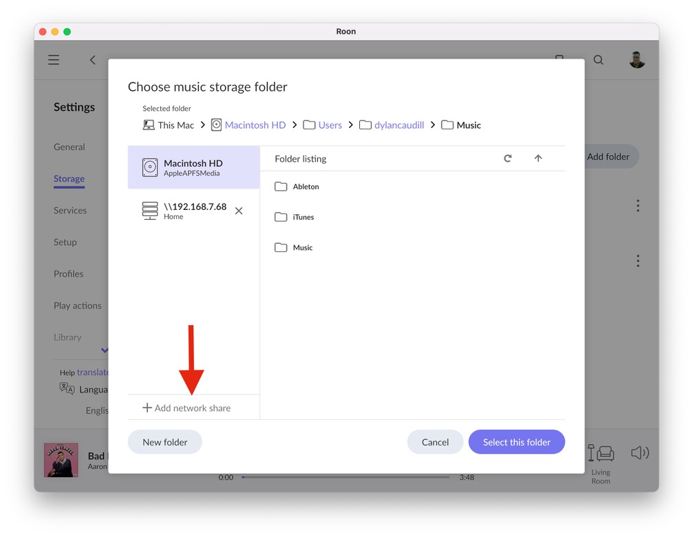 In the Roon file browser, click the Add Network Share at the bottom of the browser.