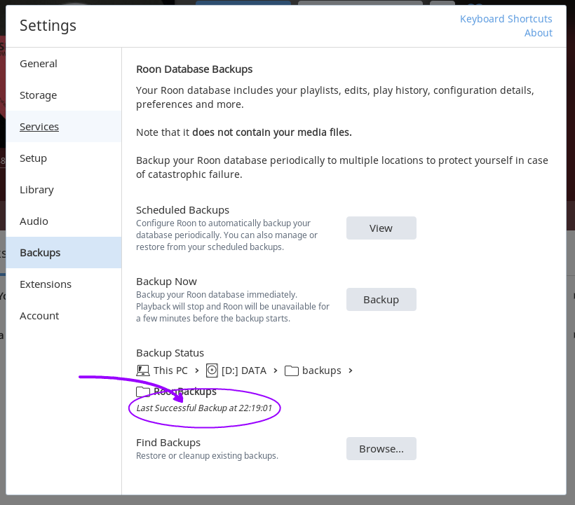 - Use Roon's file browser to locate the `/RoonBackups` folder you created in Step 1